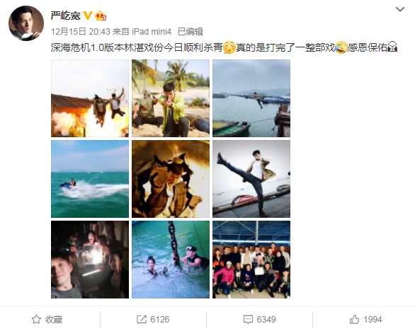 中国首部海上反恐题材电影《深海危机》自2018年11月4日开拍以来,已经过去了一个多月,近日,影片主演严屹宽宣布,由他饰演的林湛戏份顺利杀青,个人拍摄工作圆满结束。